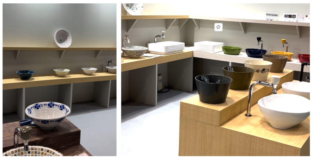 さまざまなデザインの陶器ボウルが揃っていました。美しい焼き物の色彩や絵付け、さらにはモザイクを組み合わせたものまで! 造作洗面台をオリジナルデザインでつくる際に、個性を表現できるアイテムとして魅力的です。