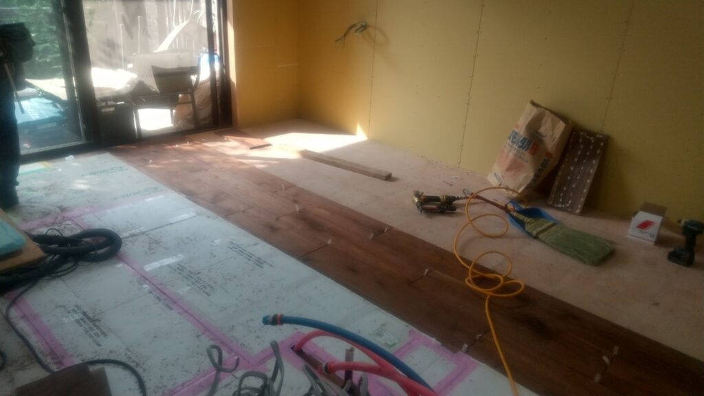 下地の12㎜合板を施工し、15㎜の無垢フローリング施工させて頂きました。