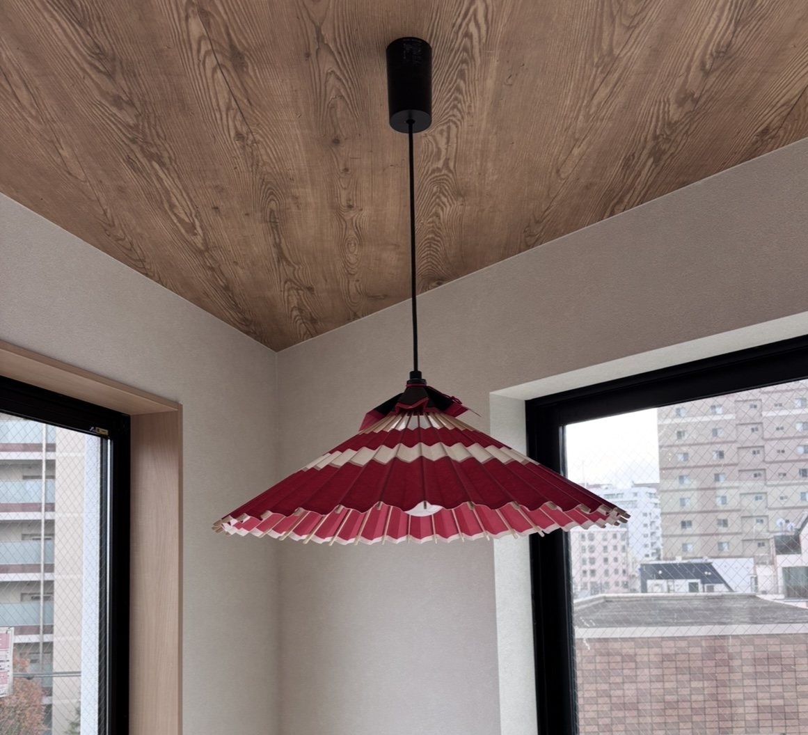 その奥で、和傘をモチーフにしたペンダントライトがふわっと迎えてくれます。