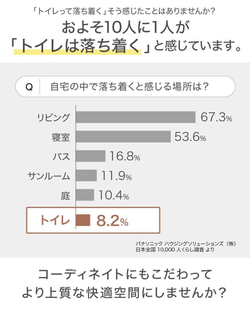 パナソニック ハウジングソリューションズ(株)が10000人の男女を対象に実施したアンケートによると、およそ10人に1人がトイレを「自宅の中で落ち着く場所」と回答しています。