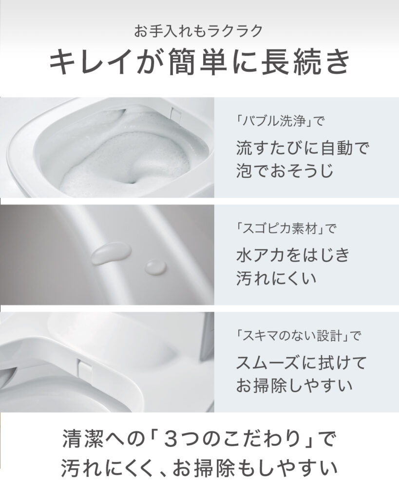 さらに、使うたび自動でお掃除してくれる「#バブル洗浄 」、陶器に比べて水アカ汚れが付きにくい独自素材「#スゴピカ素材 」、汚れが入り込みやすい隙間がなくお手入れしやすい「#スキマレス設計 」など、清潔さに配慮した機能も多数搭載。空間の美しさ、清潔さを簡単にキープできます。