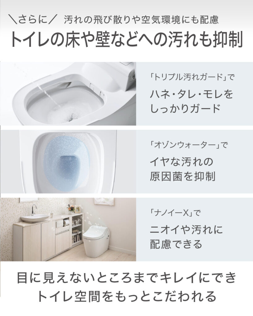 ハネ・タレ・モレを抑える「#トリプル汚れガード 」、除菌効果のある「#オゾンウォーター 」や、ニオイや汚れを抑制する「#ナノイーX 」など、見えない部分にも配慮できるのでワンランク上の心地よさを実現可能。