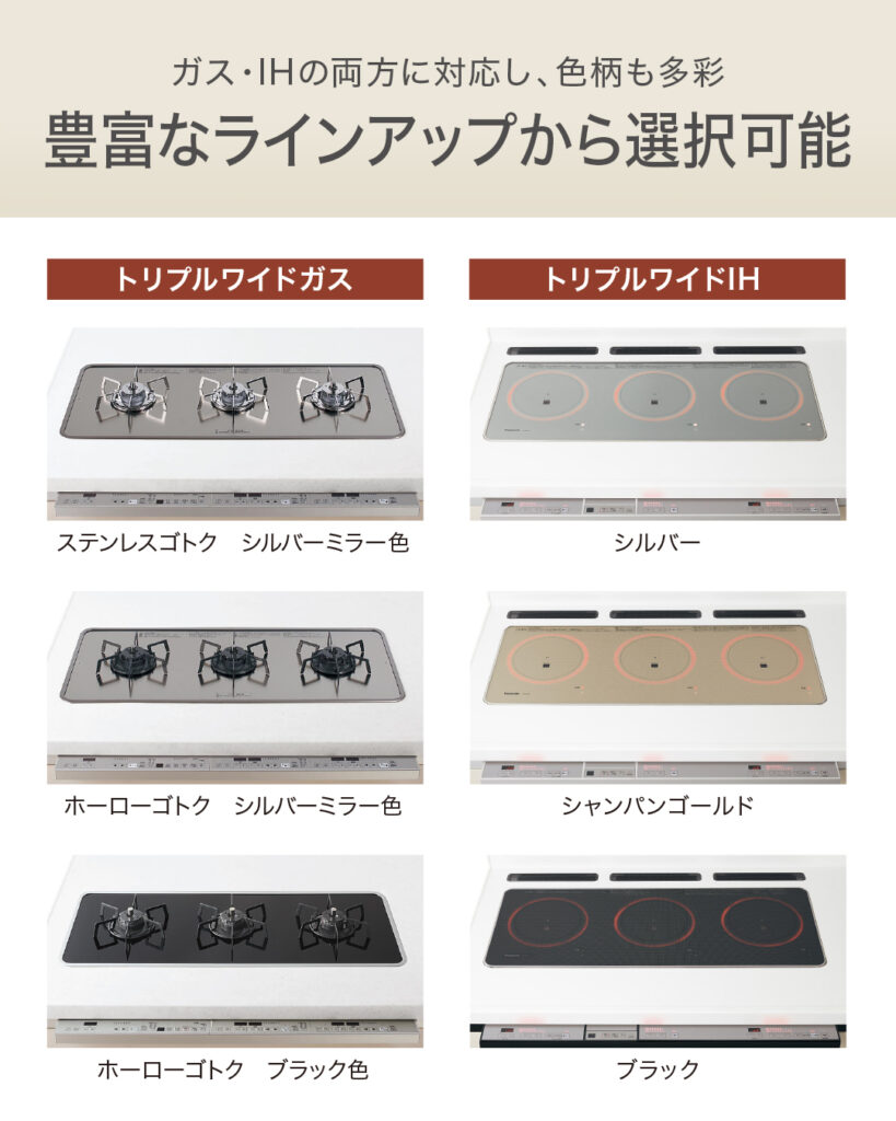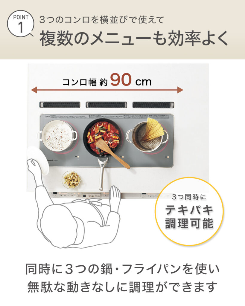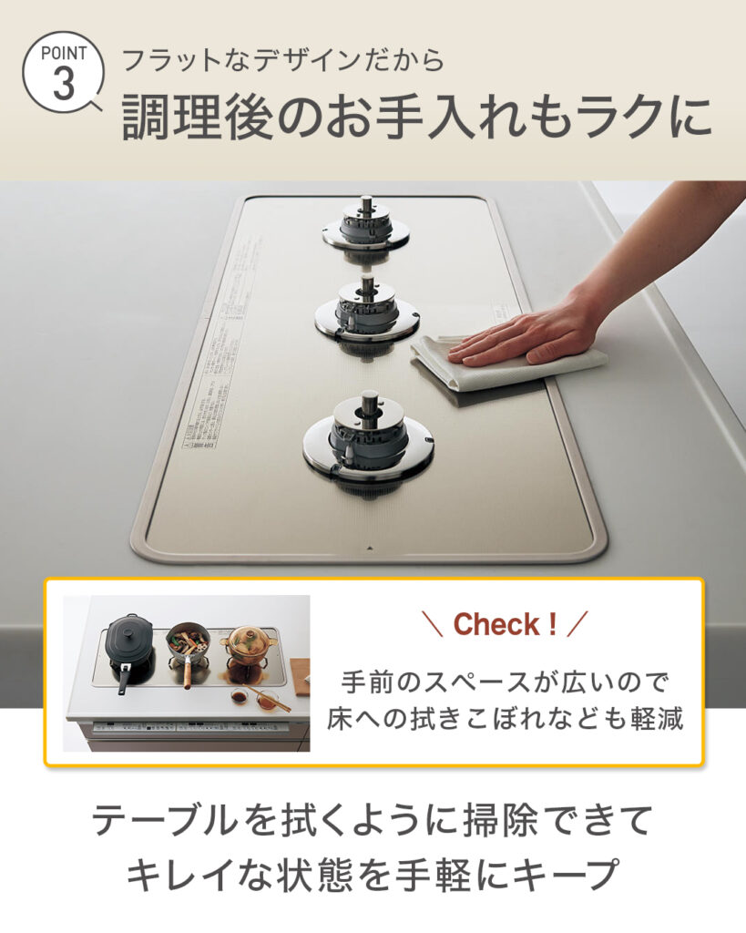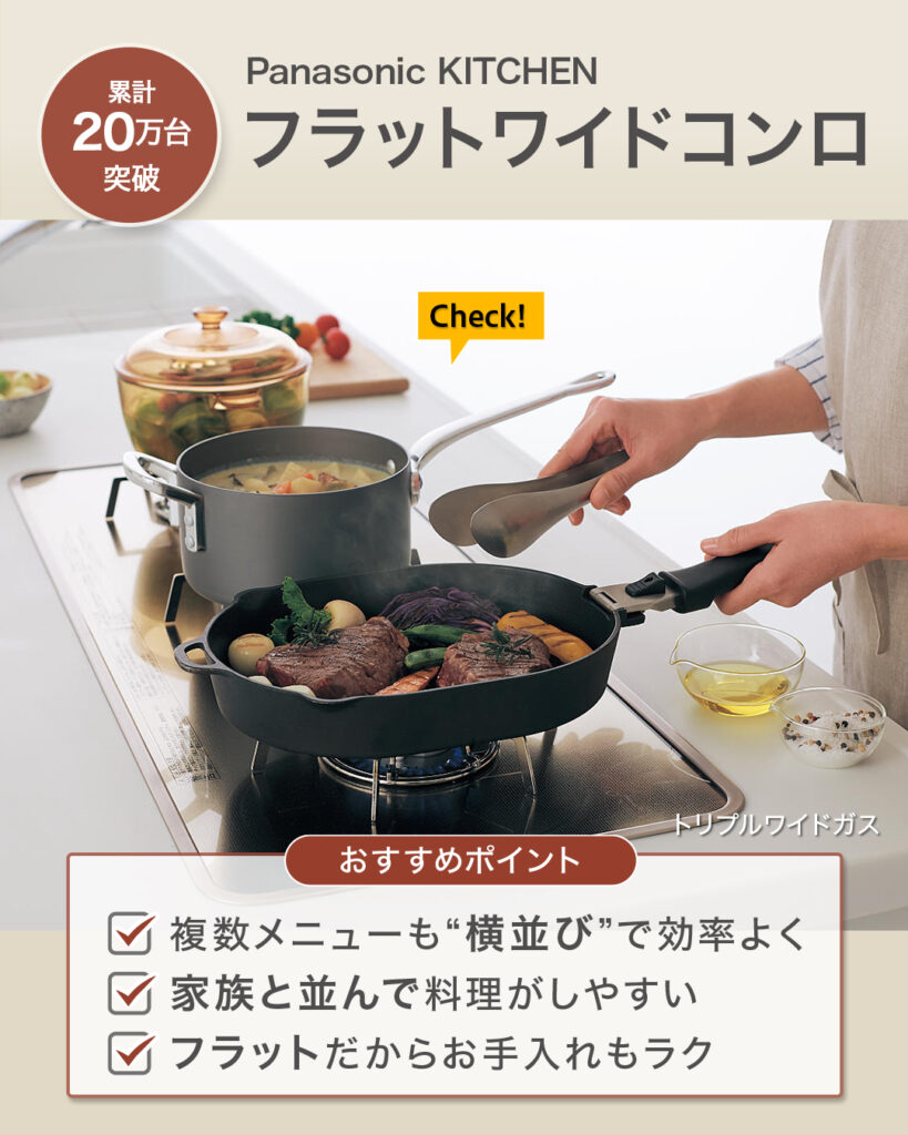 家事の時短・効率化には、横並びの3口コンロが特長の「#フラットワイドコンロシリーズ 」がおすすめです。
