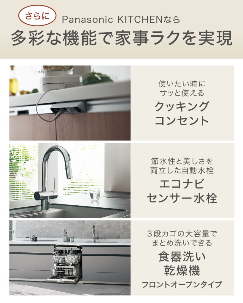 さらに、「#PanasonicKITCHEN 」には多彩なメニューの調理を音声と自動操作でサポートしてくれる「#グリルパン調理モード 」や、汚れが付きづらくお手入れの手間を減らせる「#ほっとくリーンフード 」、大容量の3段カゴで4人家族の3食分の食器を一気に洗える「#食器洗い乾燥機フロントオープンタイプ 」など、家事ラクを実現できる設備が盛りだくさん。