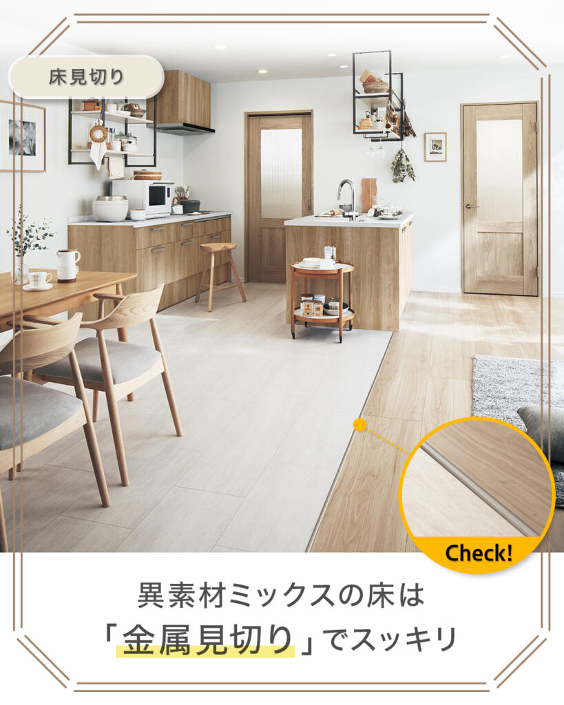 水まわりの清潔感を引き立ててくれる石目調の床材。キッチンなど、LDK空間の一部にアクセントとして取り入れたい場合は、金属製の見切り材を採用することで異素材MIXの空間をすっきりとした印象に見せることができます。