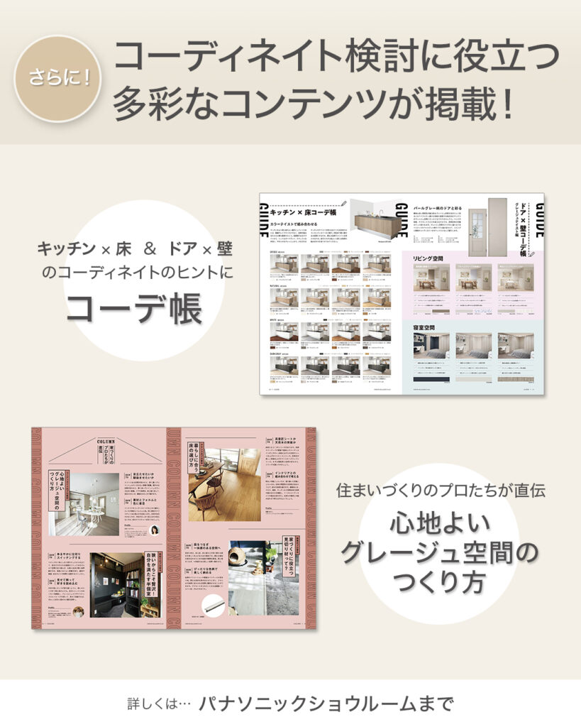 現在、パナソニックのショウルームで配布されている「ベリティスマガジン」は、多彩な実例はもちろん、「床×キッチン」「壁×ドア」のコーディネイトテクニックや、プロ視点の「グレイッシュ空間のつくり方」など、住まいづくりを考えるうえで参考になる情報が多数掲載されています。