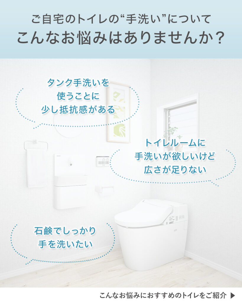トイレで用を足したあと、タンク上の水栓で手を洗うのに少し抵抗があるという方もいらっしゃるのではないでしょうか。とはいえ、トイレ内に別で手洗いを設置するのは、スペースの都合上難しいことも多いもの。