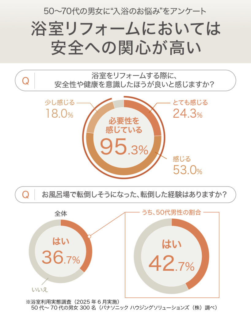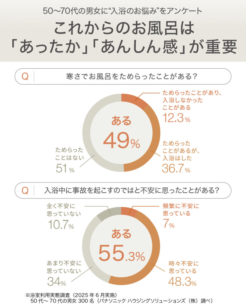 パナソニック ハウジングソリューションズ(株)が50代~70代の男女に実施したアンケートによると、約5割もの人が自宅の浴室の“寒さ”と“安全性”に不安を感じているということが明らかに。浴室のリフォームをお考えなら、あたたかさと安全性への配慮が重要です。