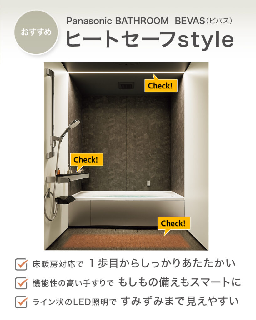 あったか、あんしん感のある浴室づくりには「#BEVAS 」の新プラン「#ヒートセーフstyle 」がおすすめ。