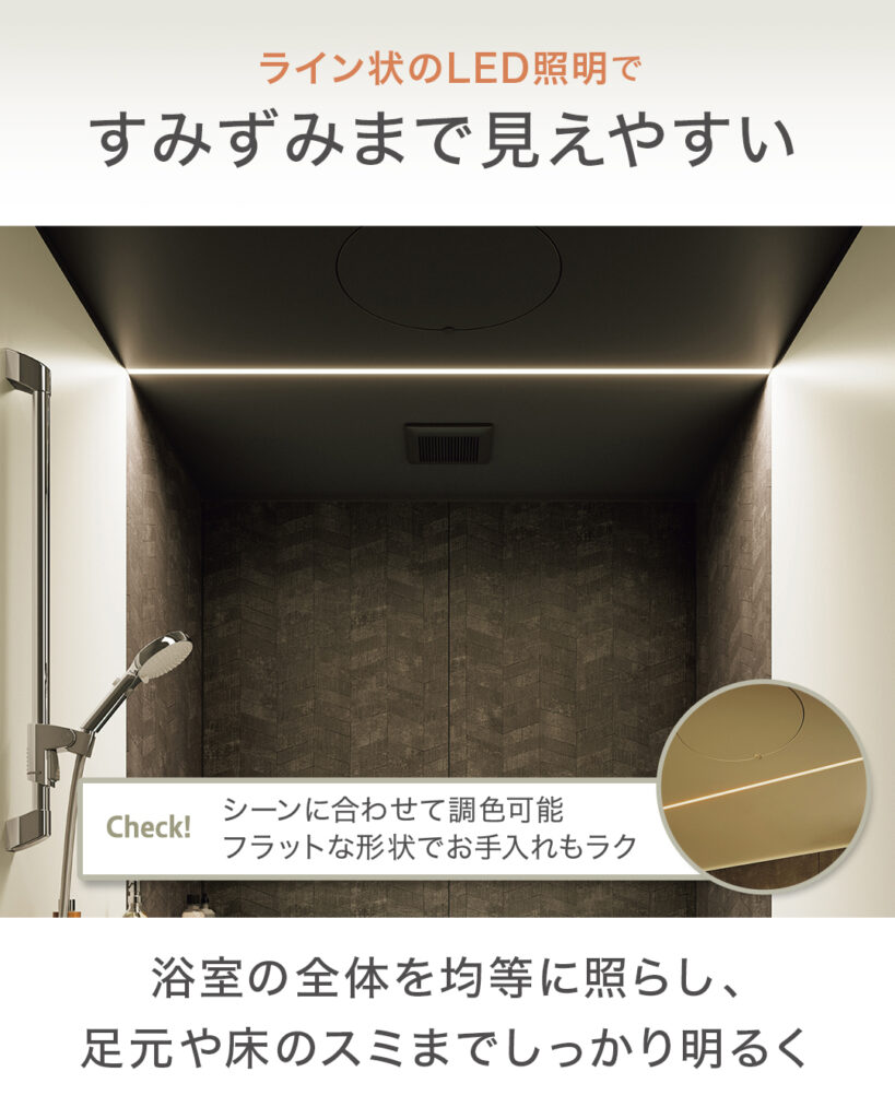天井に埋め込まれたフラットなライン状のLED照明が足元や床のスミまで明るく照らしてくれるのもうれしいポイント。