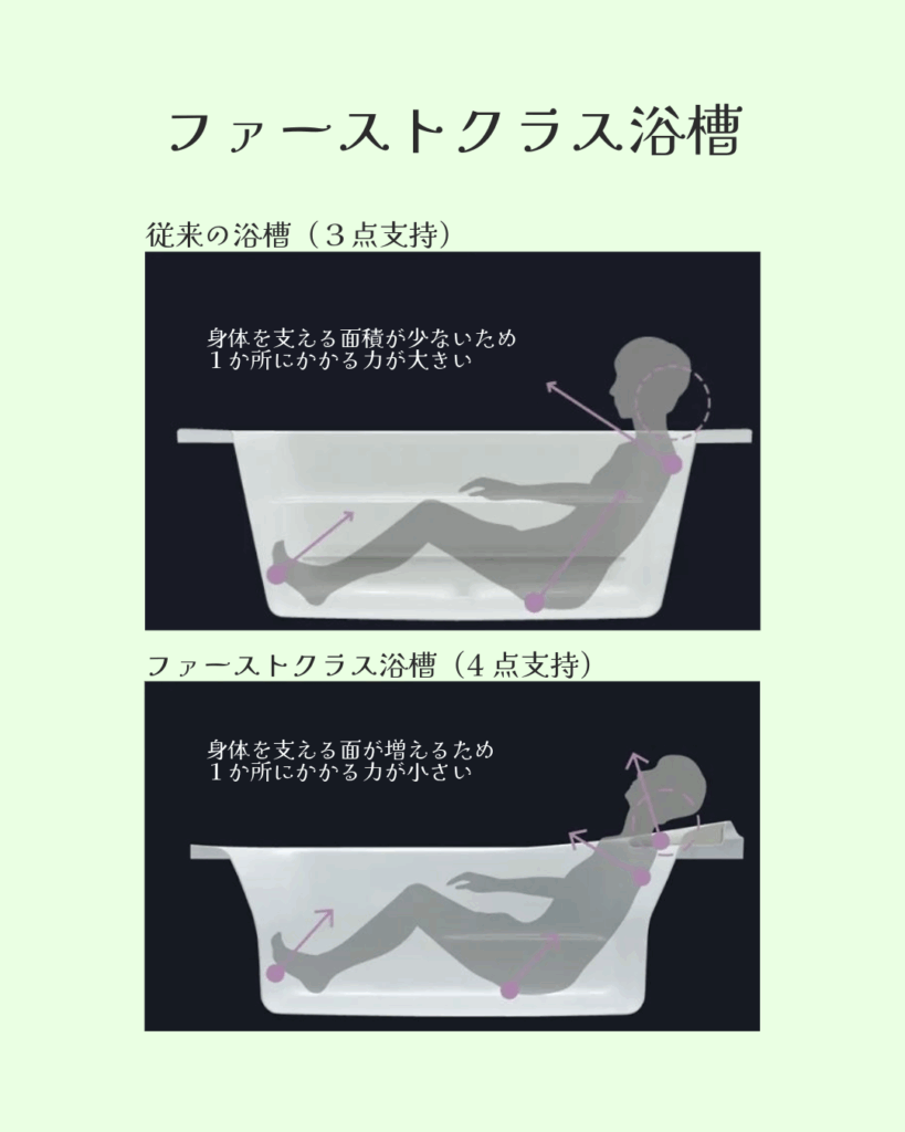 従来の浴槽だと、背中の一部とお尻、足の3点で身体を支えていましたが、