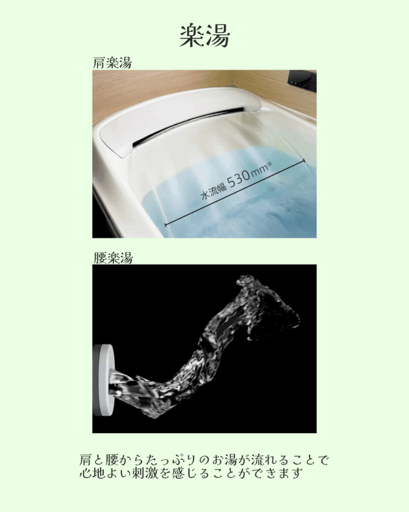 肩楽湯と腰楽湯はTOTO独自の機能で、肩と腰からたっぷりのお湯が流れることで