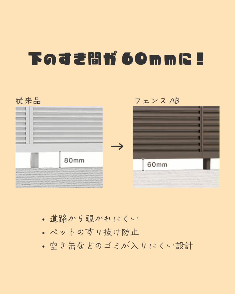 また、従来品はフェンスの下の隙間が80㎜でしたが、
