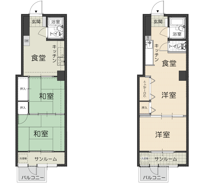 - 3Kから1DKへと間取りを変更し、ゆったりとしたダイニングと使いやすい居室空間を両立