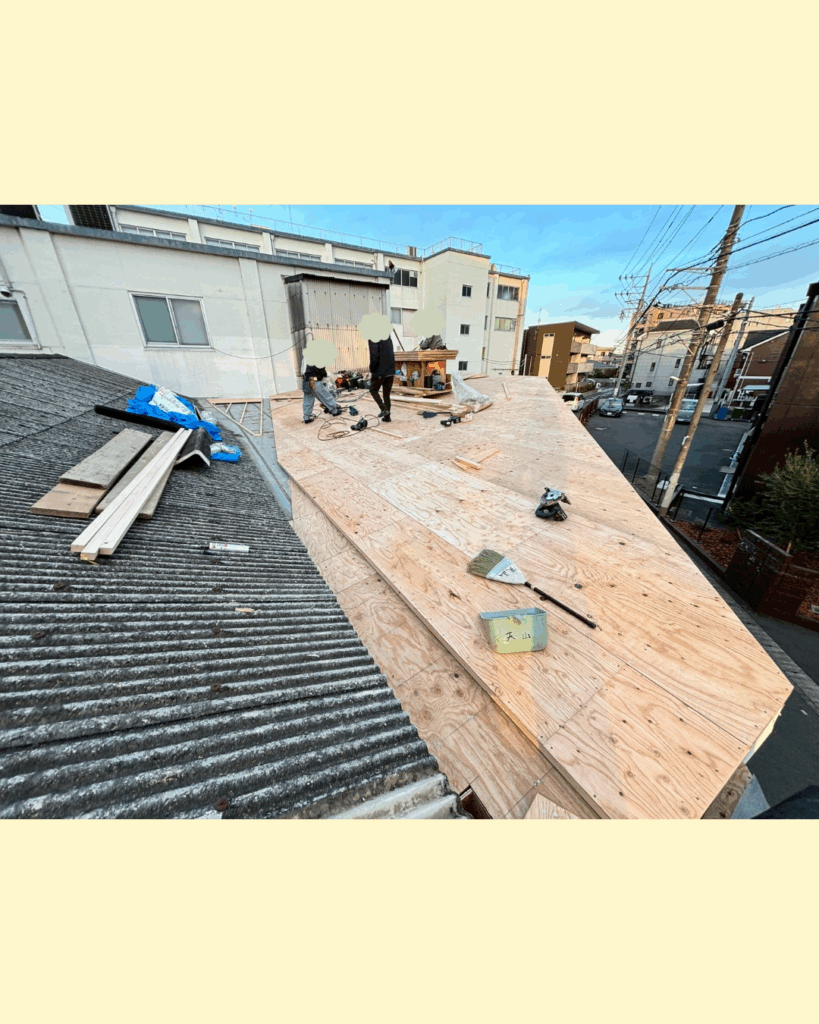 野地板が張り終わったらルーフィングと呼ばれる防水のシートを敷きます。