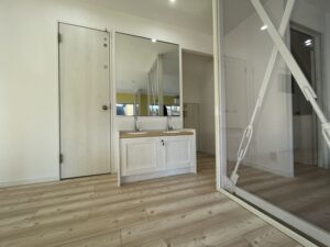 ☝造作洗面台を制作、設置しました。もちろん扉は鍵付き。右側の壁は構造体でどうしても撤去できない柱とブレス。両面にアクリル板を収めることでけが防止に。