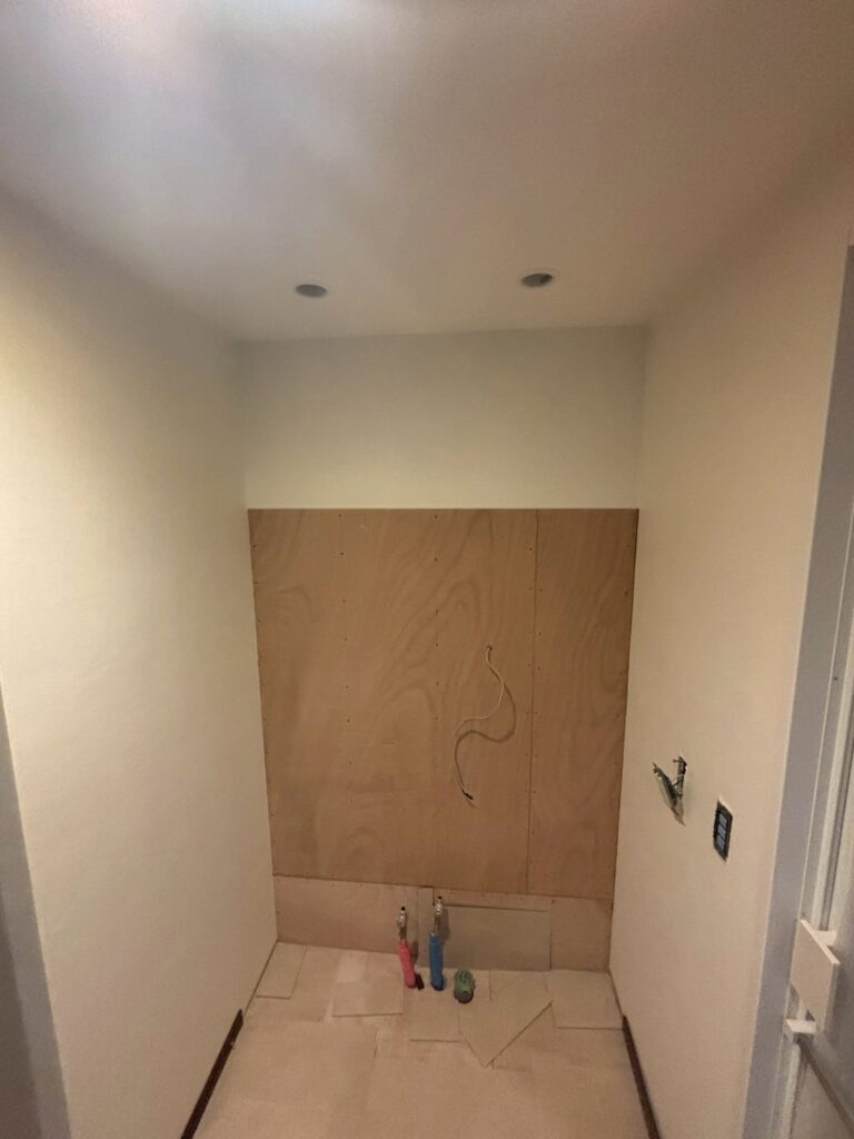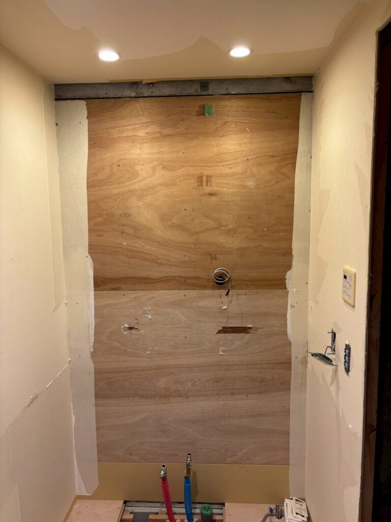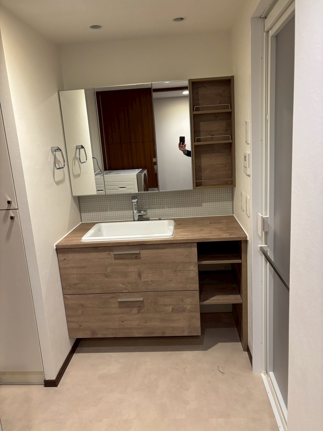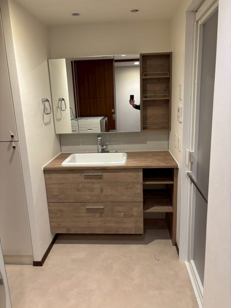 既存の洗面化粧台を解体し、給排水工事・電気工事を行い、クロス・フロアタイルを貼り換えます!