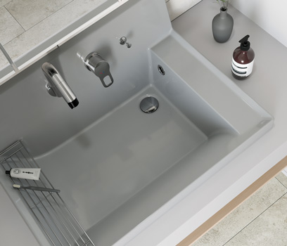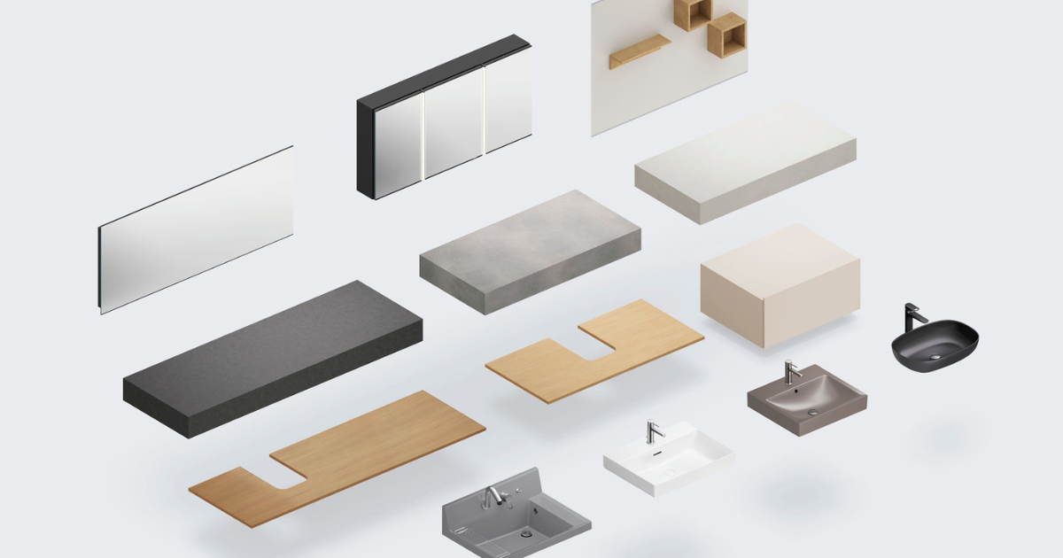 従来の「ユニット式」の機能性はそのままに、カウンター、ボウル、ミラー、水栓を自由に組み合わせることで、