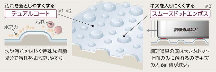 デュアルコートは汚れがこびりつきにくいため、日々の「ついで掃除」だけでピカピカの状態を維持できます。