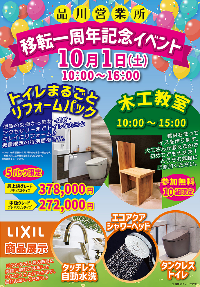 品川営業所イベント開催のお知らせ イベント, キッチン, トイレ, リフォーム, 会社, 内装工事, 品川営業所, 商品, 商材, 水回り 2022年9月27日 品川営業所が現在の場所に移転して一周年を記念して、イベントを開催いたします。 限定のトイレリフォームパックの販売や、親子でご参加いただける木工教室の開催、 リクシルの人気商品を体感できる実機展示などを行います。 武蔵小山商店街パルムからすぐ、荏三公園の向かいです。 お買い物がてら、どうぞお気軽にお立ち寄りください。