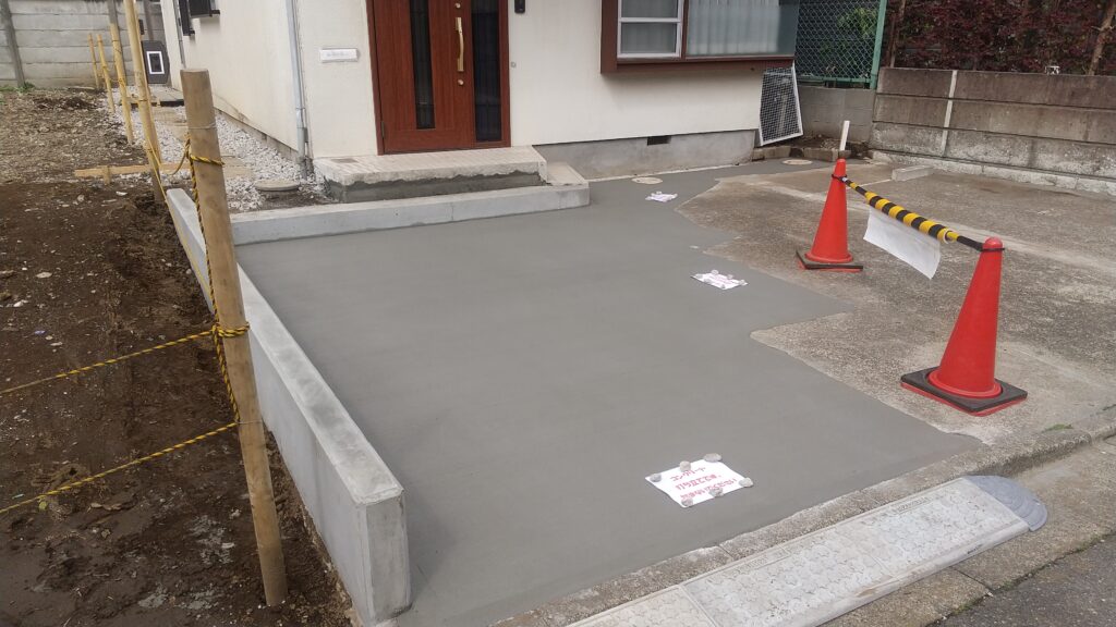 外構工事【目黒区・世田谷区・品川区】 エクステリア, フェンス・門扉, リフォーム, 外構工事, 大田営業所 2021年5月12日 遣り方解体根伐り基礎立上げ→砕石敷き→ワイヤーメッシュを敷いて→コンクリート打設乾燥させてから左官タイル工事完成 既存→テラス屋根(スピーネF型)設置