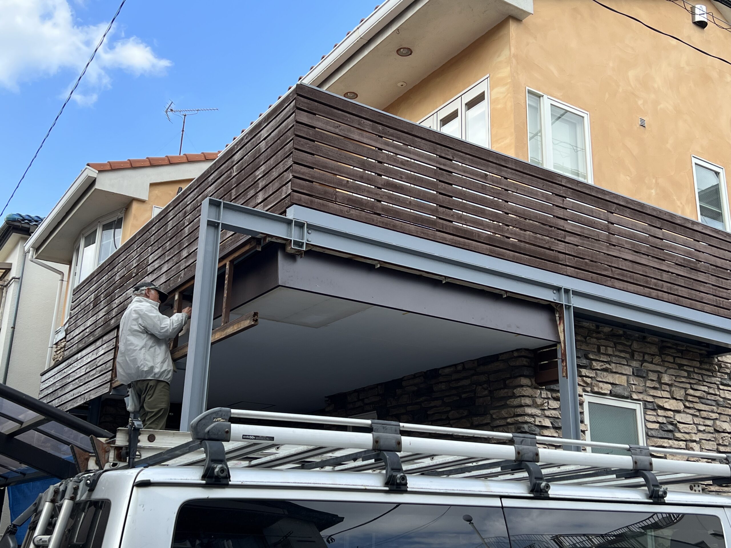 今回は現場の前を走る電線の関係で材木を吊って運ぶレッカー車が使用できなかったので