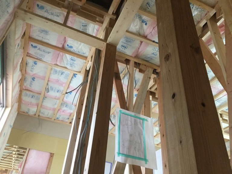 奥沢新築工事も天井の野縁組を終え断熱材を入れました。