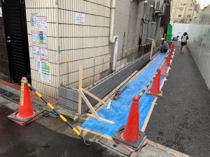 ※ベースコンクリートが固まったらCBを積んでいきます。1段、2段。。。。人の通りが多いので、ガードマンもしっかり手配して行っています。