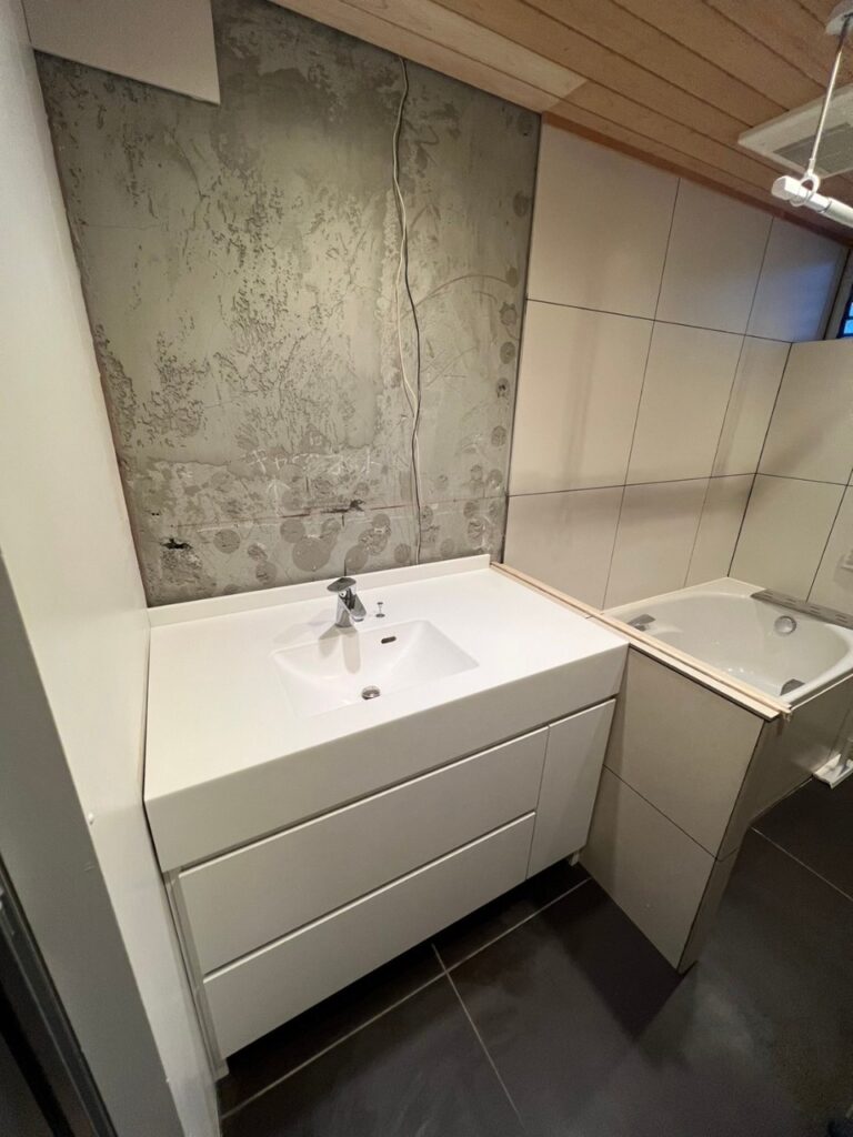 洗面台交換工事 タイル施工 お風呂, デザイン, プラン(提案), リフォーム, 内装, 内装工事, 大田営業所, 施工前, 施工後, 洗面台 2023年2月4日 こんにちは 以前ご紹介いたしました現場の続きです! 今回はコンクリートがむき出しだったところに タイルを貼って仕上げました。 次はここに三面鏡を取り付けます! では次回をお楽しみに