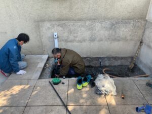 ①キレイに斫りが終わったら配管関係を整理します。※植木、花が成長すると根が張るので配管が破損しないように切り回します。