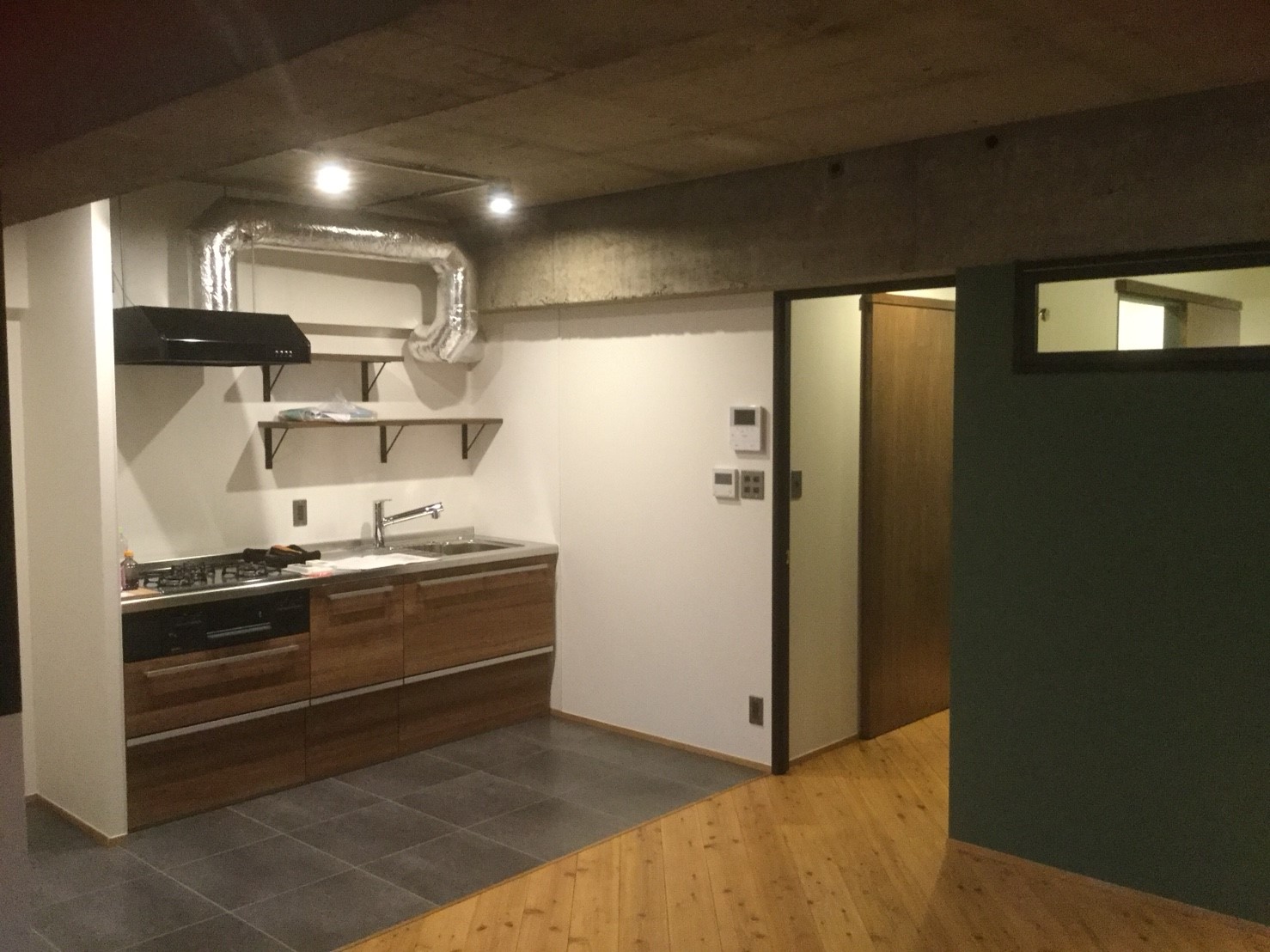 床を無垢の杉フローリング、キッチン周りを 塩ビのフロアタイル 壁を色の強い壁紙 天井むき出し