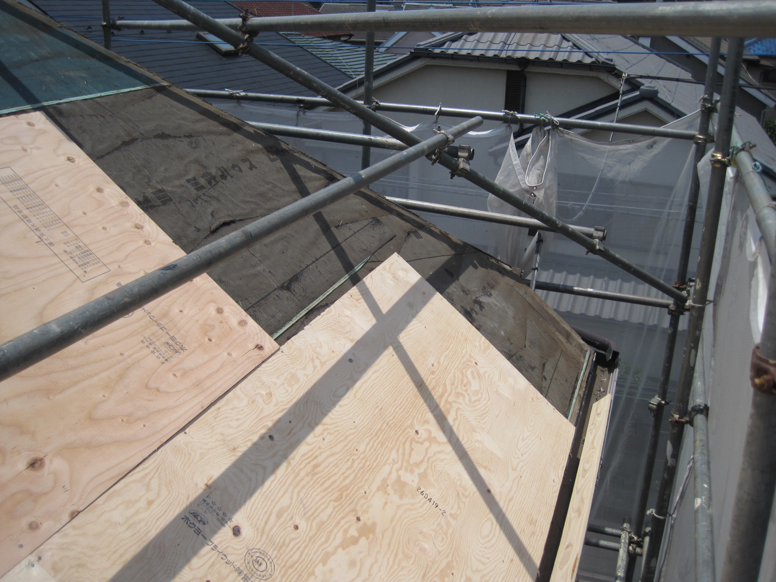 既存コロニアルを剥がし、コンパネを張り増ししてアスファルトルーフィング(マルエス カラー)を施工します。