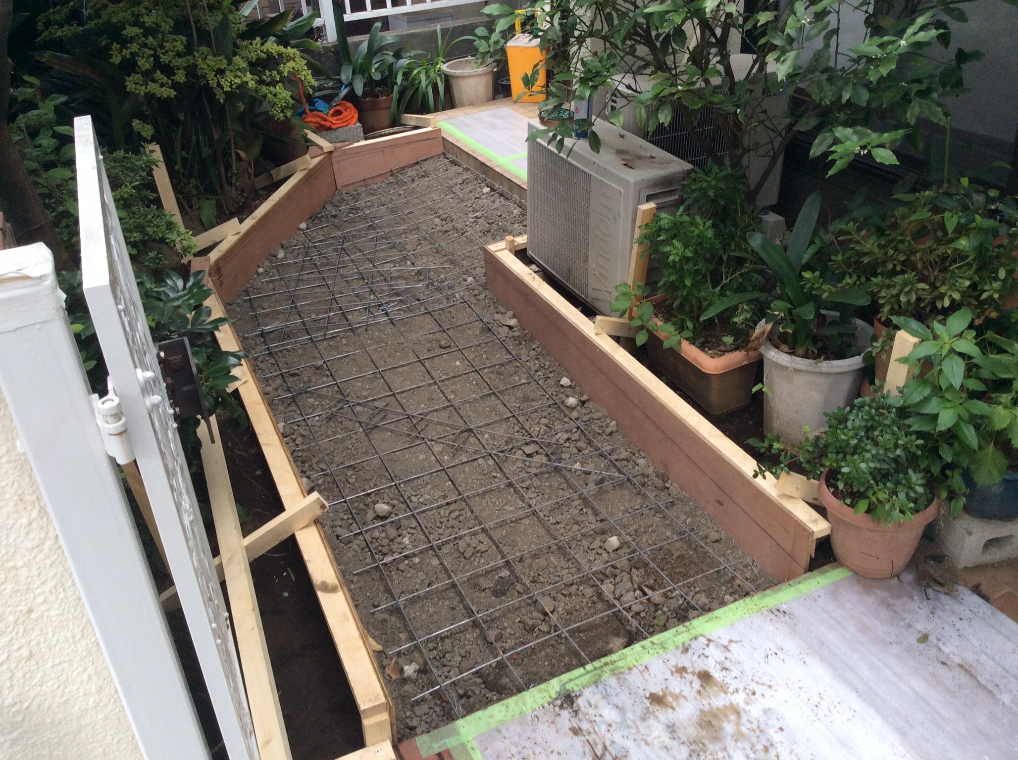 既存のアプローチは土が露出している形で既存の土間との段差があり車椅子での移動はできません。 地面を掘り起こし、鉄筋を配置、枠を立ててコンクリートを打設します。