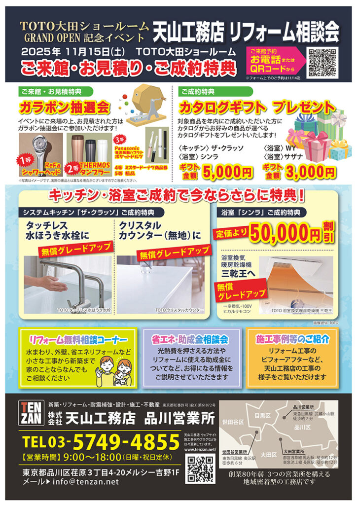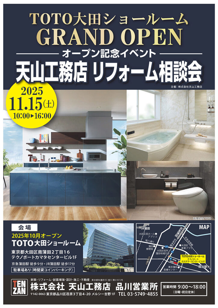 2025年11月15日(土)10:00~16:00に新しくなったTOTO大田ショールームにて天山工務店主催「TOTO大田ショールーム GRAND OPEN オープン記念イベント 天山工務店リフォーム相談会」を開催します。